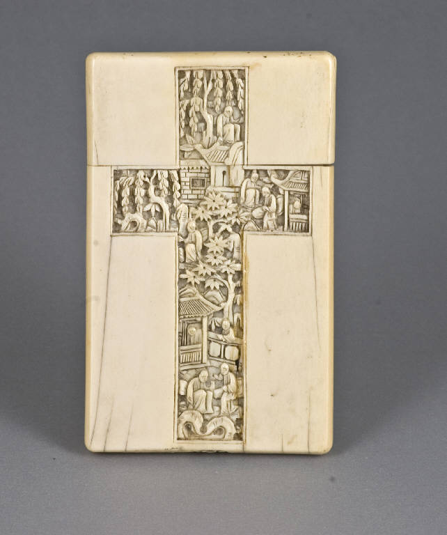 - NOTIZIE STORICO CRITICHE Non compaiono chiari e sufficienti elementi per decifrare le scene nelle due riserve; tuttavia, non è impossibile che vi siano riferimenti alla religione cristiana, forse alla vita dello stesso Gesù Cristo, la cui immagine è prima di tutto richiamata dalla forma cruciforme dei cartigli. Questa interpretazione deve aver indotto, almeno in parte, anche il Lanfranchi all'acquisto di questo oggetto. Da una lettera del 20 gennaio 1968, conservata all'interno del portacarte, apprendiamo infatti che il pezzo fu comprato dal collezionista lombardo, probabilmente in quello stesso anno, da Adalbert Offermann e Hans-Martin Schmitz, antiquari di Colonia (Theodor-Heuss-Ring 54) specializzati in arte giapponese ("Netzuke-Lacke-Schwerter-Schwertzierate-Farbholzschnitte-Kakemono-Orientalische Waffen-Varia"); inoltre, nel testo della missiva si legge che, in occasione dell'invio di una tsuba precedentemente acquistata, si inviava anche questo pezzo, "an extremely rare and interesting chinese card-case in ivory with a pure Christian influence you must have. Only 220."