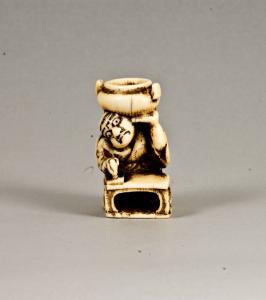 Netsuke raffigurante un uomo inginocchiato davanti ad un basso tavolino, sopra il quale è posato un foglio sul quale egli stesso sta scrivendo usando la mano destra; con quella sinistra, invece, si aiuta a sostenere un grande incensiere.