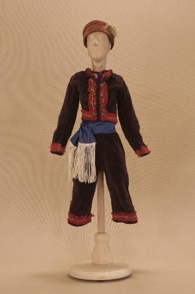 Costume da uomo spagnolo composto da pantaloni, bolero, cravatta, fascia e cappello.
