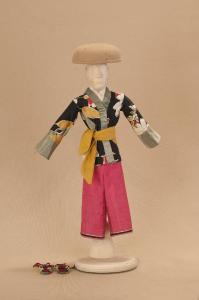 Costume da uomo giapponese composto da pantaloni, giacca, collo, fascia e sandali. Si completa con un cappello che ha il codice GOR 03372.