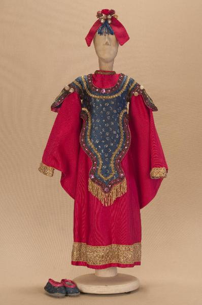 - NOTIZIE STORICO CRITICHE Il costume è stato realizzato per lo spettacolo "La Lampada di Aladino", che nasce come riduzione teatrale per marionette nel 1994. L¿argomento è tratto dalla fiaba "Aladino e la lampada meravigliosa", appendice della raccolta "Le Mille e Una Notte". Lo spettacolo di Eugenio Monti Colla, andato in scena in prima mondiale al Festival di Spoleto con musiche di Danilo Lorenzini, snoda il racconto in tredici quadri di ambientazione cinese come indicato nella fiaba d¿origine e narra l¿evoluzione del protagonista da giovinetto a uomo maturo attraverso vicende di carattere fantastico e simbolico.