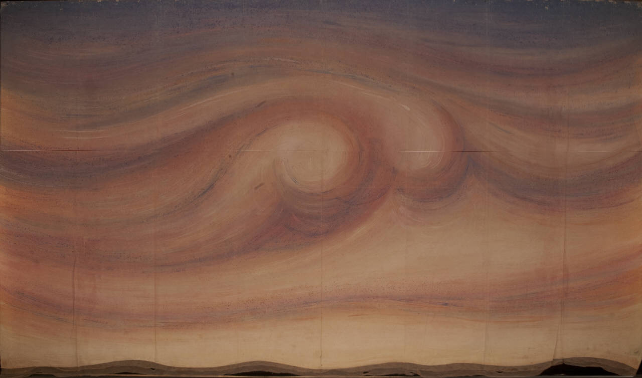 Sipario in tela di cotone e dipinta con colori ad acqua. L'elemento scenico è concluso nel lato inferiore con una fascia in tulle a maglia esagonale.