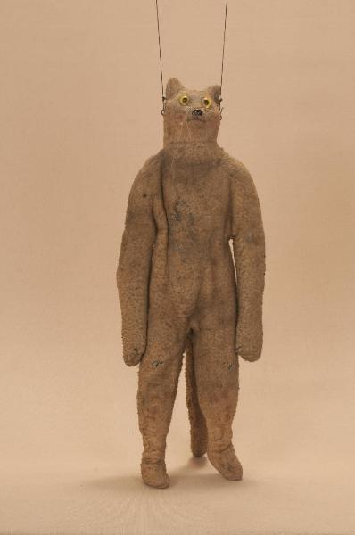 Testa in cartapesta con anima in legno di abete rivestita di cotone felpato e fissata con ferro al busto in cartapesta con rinforzi in abete; inserimento occhi di vetro rotondi da animale; inserimento bottone in osso tagliato, per il naso; gambe attaccate con striscia di tela al busto; ginocchia ad incastro e piedi mobili; mani in tiglio fisse con dita scolpite ed unite. La figura è rivestita da una tuta, comprensiva di coda, di cotone felpato color nocciola sporco raccordata al collo. Bilancino a croce metodo Holden.