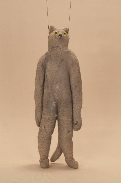 Testa in cartapesta con anima in legno di abete rivestita di cotone felpato e fissata con ferro al busto in cartapesta con rinforzi in abete; inserimento occhi di vetro rotondi da animale; inserimento bottone in osso tagliato, per il naso; gambe attaccate con striscia di tela al busto; ginocchia ad incastro e piedi mobili; mani in tiglio fisse con dita scolpite ed unite. La figura è rivestita da una tuta, comprensiva di coda, di cotone felpato color grigio maculato sporco raccordata al collo. Bilancino a croce metodo Holden.
