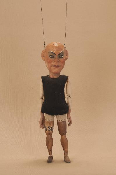 - NOTIZIE STORICO CRITICHE Trattasi di maschera orientale applicata su una base di legno e uniformata con gesso. La maschera è stata acquistata all'Esposizione Internazionale di Milano del 1906, Padiglione Giappone. Nel 1911, in occasione dell'allestimanto dello spettacolo "I Nani Burloni" al Teatro Gerolamo, è stato costruito il corpo su cui è stata montata la maschera adattata a testa di marionetta. Nel percorso di evoluzione della tecnica di animazione le mani rigide a spatola, di tradizione ottocentesca, sono state sostituite da mani mobili. Dal 1911, la marionetta fu utilizzata principalmente per lo spettacolo "I nani burloni".\nLo spettacolo "I nani burloni" è un'azione fantastica di Carlo II Colla tratto da una leggenda di Natale. La messa in scena si avvale della musica di Felice Camesasca e Andrea Mormina, delle scene di Achille Lualdi e dei costumi ideati dallo stesso Carlo II Colla.\nIl primo allestimento risale al 1921 e fino alla fine degli anni cinquanta, ad ogni dicembre il fremito delle prossime vacanze natalizie invadeva anche il palcoscenico del Teatro Gerolamo di Milano per le tradizionali rappresentazioni dello spettacolo "I nani burloni". Il racconto su cui Carlo II Colla basò la propria versione marionettistica, è tratto dalla tradizione leggendaria del Nord Europa e narra una vicenda ambientata proprio nella Notte di Natale. Ciò dava l'occasione per ricostruire un'atmosfera natalizia ricca di magiche apparizioni e per materializzare così, sul palcoscenico delle marionette, le fantasie di ogni adulto e bambino legate al fascino rituale di questo magico momento dell'anno. Lo spettacolo è un ulteriore esempio di quella straordinaria forma che mescola narrazione, canto, musica, scenografie sontuose e movimenti coreografici di un centinaio di marionette.