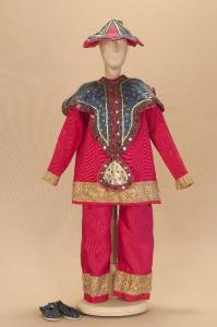 - NOTIZIE STORICO CRITICHE Il costume è stato realizzato per lo spettacolo "La Lampada di Aladino", che nasce come riduzione teatrale per marionette nel 1994. L¿argomento è tratto dalla fiaba "Aladino e la lampada meravigliosa", appendice della raccolta "Le Mille e Una Notte". Lo spettacolo di Eugenio Monti Colla, andato in scena in prima mondiale al Festival di Spoleto con musiche di Danilo Lorenzini, snoda il racconto in tredici quadri di ambientazione cinese come indicato nella fiaba d¿origine e narra l¿evoluzione del protagonista da giovinetto a uomo maturo attraverso vicende di carattere fantastico e simbolico.