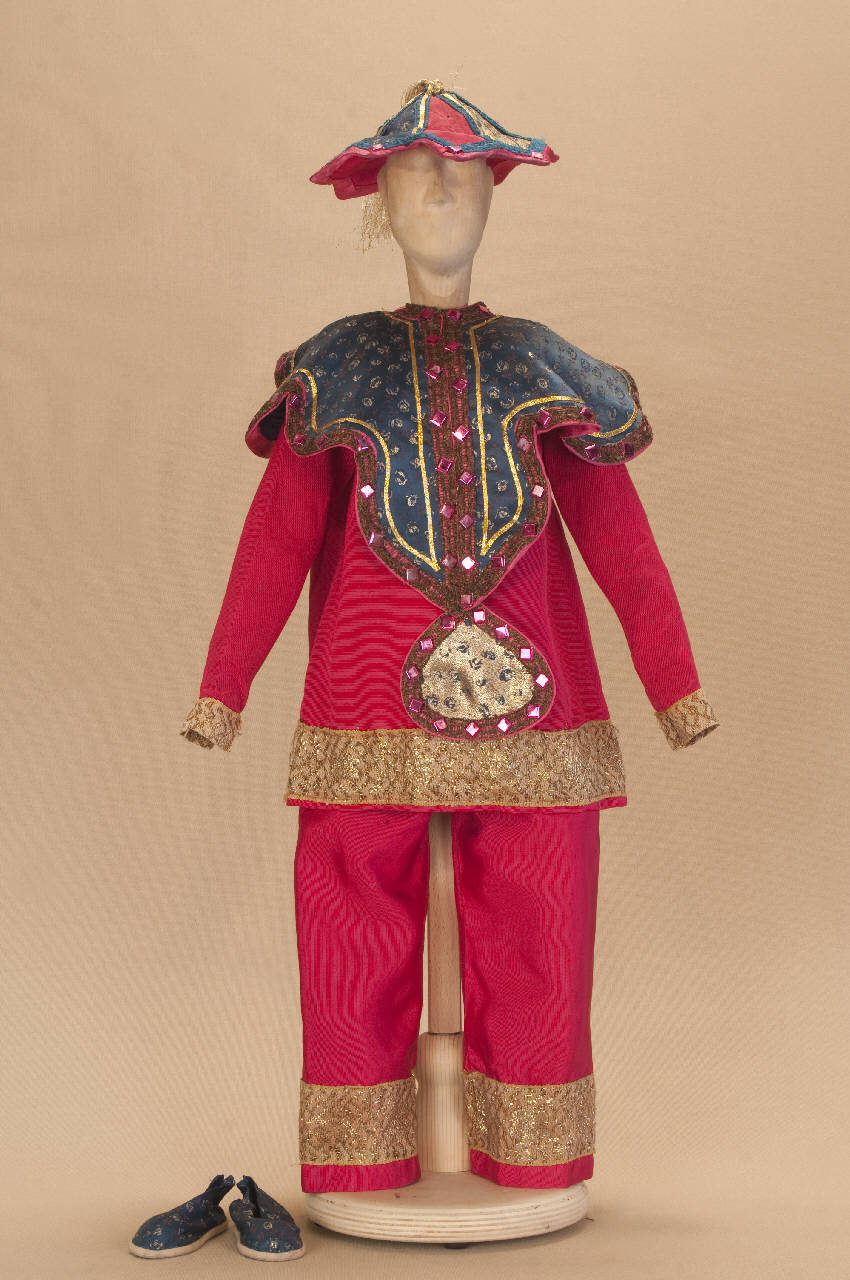 - NOTIZIE STORICO CRITICHE Il costume è stato realizzato per lo spettacolo "La Lampada di Aladino", che nasce come riduzione teatrale per marionette nel 1994. L¿argomento è tratto dalla fiaba "Aladino e la lampada meravigliosa", appendice della raccolta "Le Mille e Una Notte". Lo spettacolo di Eugenio Monti Colla, andato in scena in prima mondiale al Festival di Spoleto con musiche di Danilo Lorenzini, snoda il racconto in tredici quadri di ambientazione cinese come indicato nella fiaba d¿origine e narra l¿evoluzione del protagonista da giovinetto a uomo maturo attraverso vicende di carattere fantastico e simbolico.