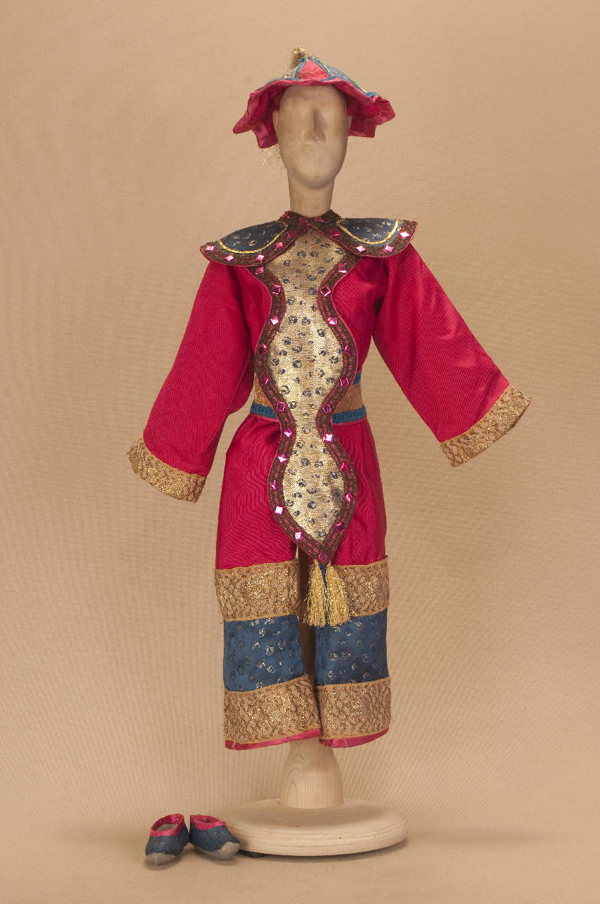 - NOTIZIE STORICO CRITICHE Il costume è stato realizzato per lo spettacolo "La Lampada di Aladino", che nasce come riduzione teatrale per marionette nel 1994. L¿argomento è tratto dalla fiaba "Aladino e la lampada meravigliosa", appendice della raccolta "Le Mille e Una Notte". Lo spettacolo di Eugenio Monti Colla, andato in scena in prima mondiale al Festival di Spoleto con musiche di Danilo Lorenzini, snoda il racconto in tredici quadri di ambientazione cinese come indicato nella fiaba d¿origine e narra l¿evoluzione del protagonista da giovinetto a uomo maturo attraverso vicende di carattere fantastico e simbolico.