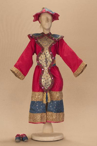 - NOTIZIE STORICO CRITICHE Il costume è stato realizzato per lo spettacolo "La Lampada di Aladino", che nasce come riduzione teatrale per marionette nel 1994. L¿argomento è tratto dalla fiaba "Aladino e la lampada meravigliosa", appendice della raccolta "Le Mille e Una Notte". Lo spettacolo di Eugenio Monti Colla, andato in scena in prima mondiale al Festival di Spoleto con musiche di Danilo Lorenzini, snoda il racconto in tredici quadri di ambientazione cinese come indicato nella fiaba d¿origine e narra l¿evoluzione del protagonista da giovinetto a uomo maturo attraverso vicende di carattere fantastico e simbolico.