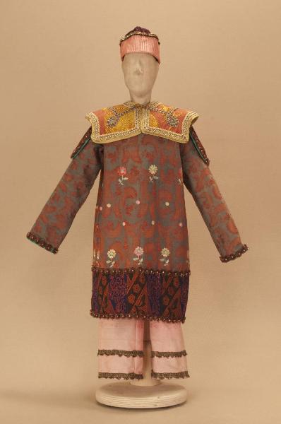 - NOTIZIE STORICO CRITICHE Si completa con scarpe. Il costume è stato realizzato per lo spettacolo "La Lampada di Aladino", che nasce come riduzione teatrale per marionette nel 1994. L¿argomento è tratto dalla fiaba "Aladino e la lampada meravigliosa", appendice della raccolta "Le Mille e Una Notte". Lo spettacolo di Eugenio Monti Colla, andato in scena in prima mondiale al Festival di Spoleto con musiche di Danilo Lorenzini, snoda il racconto in tredici quadri di ambientazione cinese come indicato nella fiaba d¿origine e narra l¿evoluzione del protagonista da giovinetto a uomo maturo attraverso vicende di carattere fantastico e simbolico.