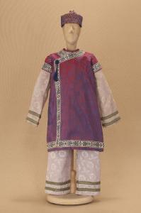 - NOTIZIE STORICO CRITICHE Si completa con scarpe. Il costume è stato realizzato per lo spettacolo "La Lampada di Aladino", che nasce come riduzione teatrale per marionette nel 1994. L¿argomento è tratto dalla fiaba "Aladino e la lampada meravigliosa", appendice della raccolta "Le Mille e Una Notte". Lo spettacolo di Eugenio Monti Colla, andato in scena in prima mondiale al Festival di Spoleto con musiche di Danilo Lorenzini, snoda il racconto in tredici quadri di ambientazione cinese come indicato nella fiaba d¿origine e narra l¿evoluzione del protagonista da giovinetto a uomo maturo attraverso vicende di carattere fantastico e simbolico.