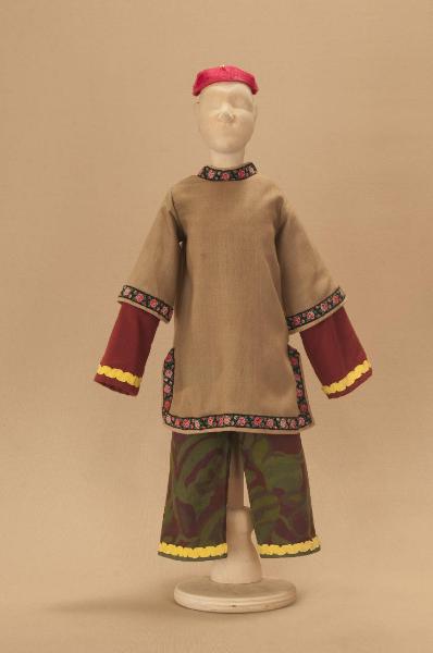 Costume da bambino cinese composto da pantaloni, veste e cappello.