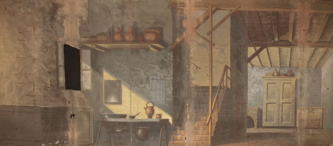 Scenografia in carta, fortezzata con strisce di tessuto di cotone, dipinta ad acqua e composta da un solo fondale.