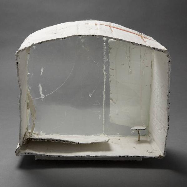Cella quattro, spazio mistico con copertura arcuata, caratterizzata da una linea rossa tracciata a destra per metà superficie. Fronte completamente aperto, retro chiuso da due frammenti di vetro soffiato a bocca, di cui uno con andamento a cuspide e tracce di colla trasparente. Internamente a destra un piccolo altare-mensa rettangolare in ferro e un sottile frammento di carta incollato a sinistra. Sul pavimento della cella, nell'angolo in fondo a sinistra, un ulteriore cartone bianco di forma rettangolare. Sul retro, a destra, una sorta di sportello apribile, con vistose colate materiche bianche. Sul lato sinistro, il colore bianco non è stato steso, volutamente, in modo uniforme e lascia trasparire il cartone sottostante e del colore rosso. Sempre su questo lato è incollato anche un piccolo pezzo di carta, avente un lato a dentelli.\nLa cella è conservata all'interno di una teca in plexiglass.