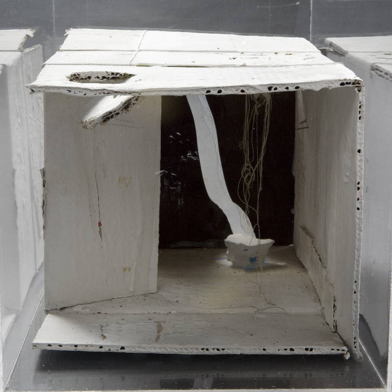 - NOTIZIE STORICO CRITICHE Per Padre Costantino le Celle, al di là di ogni intendimento estetico, ci portano "alla riscoperta di uno spazio mistico più che sacro; non organico, bensì immagine, luce e poesia; provocante ed eccitante bellezza alla liberazione dalle cose morte, per destarci nel nitore della bellezza, nel bianco luminoso e ardente". \nLe Celle colpiscono per l'elementarità di immagine, di tecniche, di materiali. \nSono piccole e semplici costruzioni, sculture tridimensionali, realizzate con materiali di recupero, cartoni, vetri, fili, legni, ferri, colori.\nPer la realizzarione delle Celle Padre Costantino usava solitamente una tempera da muro chiamata "Ducotone", filo di refe, una colla trasparente specifica per vetro detta "Peligom" della ditta Pelikan; alcune celle sono custodite, per scelta dell'artista, all'interno di teche in sicoglass.