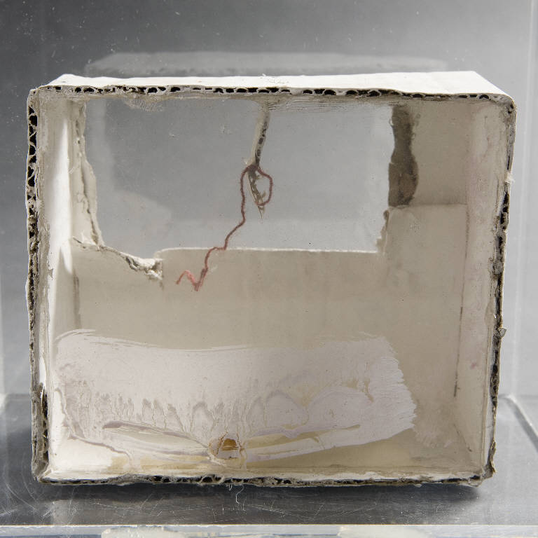 Cella ventitre, spazio mistico di piccole dimensioni con apertura rettangolare sulla parete di fondo in alto e frammento di vetro che chiude tutta la porzione antistante. Il vetro è connotato da una vistosa pennellata bianca. In alto, al centro, trattenuto da un sottile frammento di cartone, pende un filo rosa. Sul fianco destro si intravvede un frammento di etichetta in carta.\nLa cella è conservata all'interno di una teca in plexiglass.