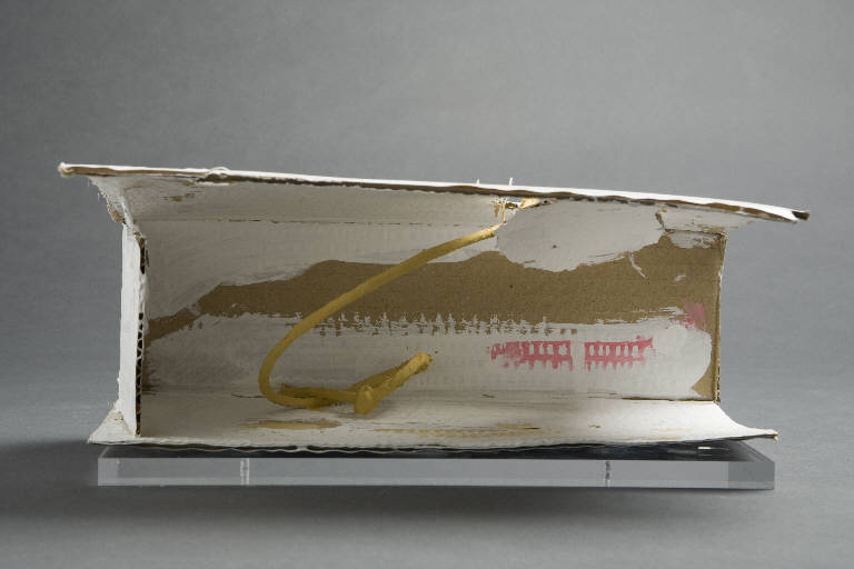 Cella, spazio mistico in cartone aperto frontalmente e sul fianco destro, con motivo quadrettato dipinta in rosa sulla parete di fondo a destra e vistosa corda tinta in color beige che, partendo dalla base, arriva al soffitto, uscendo infine da un'apertura circolare.\nLa cella è conservata all'interno di una teca in plexiglass.