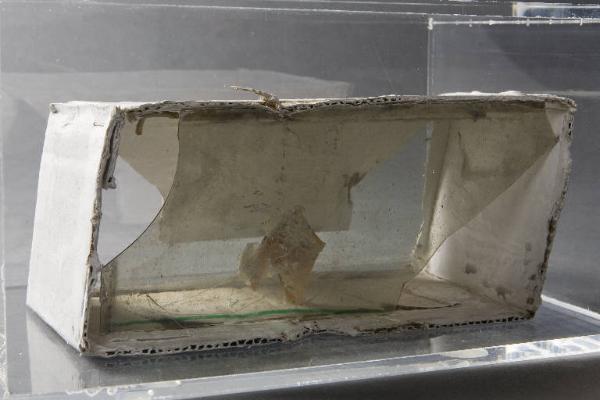 Cella, spazio mistico in cartone chiuso lungo i due lati brevi, caratterizzato anteriormente da un frammento di vetro antico soffiato e al verso da una porzione di cartone, aperto lateralmente e sollevato. Sul soffitto interno, sequenza di piccoli legnetti disposti parallelamente a fingere travetti. Sulla base, al centro, un frammento di vetro giallo con filo.\nLa cella è conservata all'interno di una teca in plexiglass.