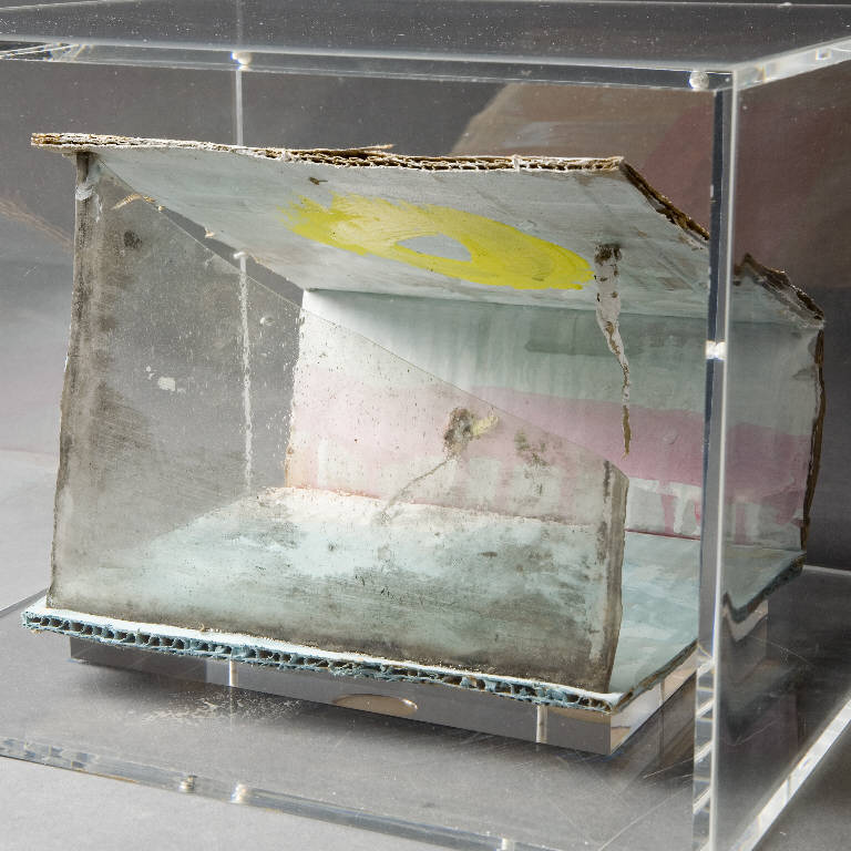 Cella, spazio mistico policromo con tetto in cartone tinto esternamente in ocra e arancione, mentre internamente presenta unicamente un sole giallo, recante a destra un frammento verticale di cartone. Sul pavimento azzurro sono adagiati due sottili frammenti di cartone. Dalla parete di fondo, parzialmente tinta in rosa, fuoriesce da un foro un filo attorcigliato con piume. La cella è chiusa anteriormente da un frammento di vetro antico soffiato.\nLa cella è conservata all'interno di una teca in plexiglass.