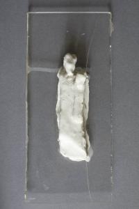 Forma bianca, da una tavoletta rettangolare in plexiglass, emerge al centro una Madonna con Bambino fortemente stilizzata. Il rilievo in gesso è stato coperto da uno spesso strato di colore bianco opaco, steso a spatola.