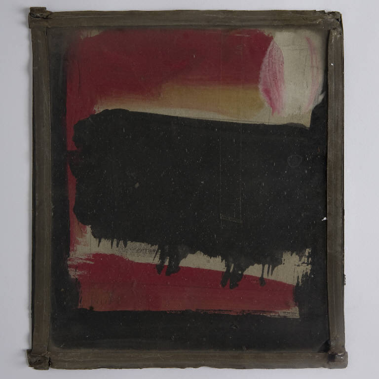 Formella quadrata di piccole dimensioni su cartoncino, con composizione a tecnica mista, protetta anteriormente da un vetro antico soffiato, di recupero. \nIl trasparente è conservato entro una cornice a piombo, scarto della lavorazione delle vatrate. Un clipeo bianco, percorso da sottili linee rosa, si staglia in alto a destra, sopra un cielo infiammato da una stesura di colore rosso e arancio. Inferiormente una vistosa macchia nera, occupa interamente lo spazio al centro, seguono una fascia rossa ed una nera.\nAl verso, sopra il cartone di recupero "Astronomia" (Armando Curcio Editore. Astronomia. Alla scoperta del cielo), spessa stesura di colore nero opaco con freccia bianca. Al verso un'etichetta rettangolare in carta bianca adesiva con il numero d'inventario 2741 in pennarello nero e sopra, depennato da due righe nere, il vecchio numero d'inventario 3301 a pennarello rosso.