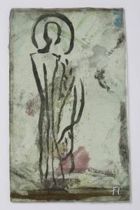 Formella quadrata di piccole dimensioni su cartoncino, con composizione a tecnica mista, protetta anteriormente da un vetro antico soffiato, di recupero. \nIl Trasparente, presenta la centro una slanciata figura aureolata, appena accennata in nero che si staglia su una parete che finge l'intonaco antico con brevi pennellate policromne. La porzione centrale del corpo del Santo, lascia trasparire volutamente la pagina di giornale sottostante usata come fondo. Al verso cartoncino beige con due firme.