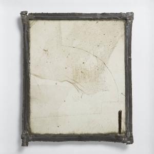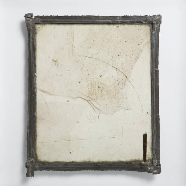 Formella quadrata di piccole dimensioni su cartoncino, con composizione a tecnica mista, protetta anteriormente da un vetro antico soffiato, di recupero. \nLa composizione è racchiusa entro una cornice realizzata con legatura in piombo antico. Nella porzione superiore è distesa una leggera ragnatela; al centro è inciso un semicerchio, ripassato a lapis. Inferiormente un piccolo clipeo reso mediante l'abrasione del cartone. In basso a destra un breve segmento marrone.\nAl verso, è stato sovrapposto un ulteriore cartoncino che tramite 5 clipei di silicone aderisce alla teca in plexiglass. Freccia in pennarello nero per indicare il verso.