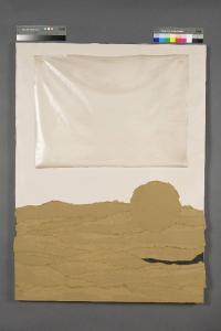 La composizione a collage di notevoli dimensioni, con fondo bianco, presenta nella porzione superiore un ampio rettangolo di plastica trasparente, incollato con silicone solo nei due angoli superiori. La porzione inferiore dell'opera si caratterizza per la prresenza di una sequenza di onde, fasce di carta marrone giustapposte, dai bordi abrasi e non ben definiti, che lasciano intravvedere una piccola porzione di fondo liscio nero. A destra si inserisce un grosso clipeo dello stesso colore delle onde.