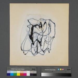 Al centro di un cartoncino quadrato beige si staglia un groviglio di linee rese a vernice nera con colatura dal pennello, riprofilate con colore a tempera grigio chiaro, quindi campite all'interno con una stesura di biacca, che delinea anche il bordo perimetrale della composizione. Al verso macchie nere e piccoli frammenti di carta.