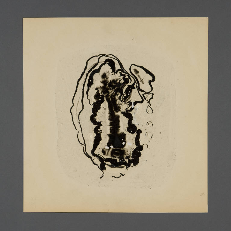 Al centro di un cartoncino di fondo, quadrato e beige, si staglia una vistosa colata di vernice nera, una macchia materica, con piccole chiazze bianche che risulta sfumata verticalmente. La spessa macchia nera centrale assume un andamento curvilineo con colate di colore dal pennello ed il fondo assume una lieve colorazione a tempera grigia.
