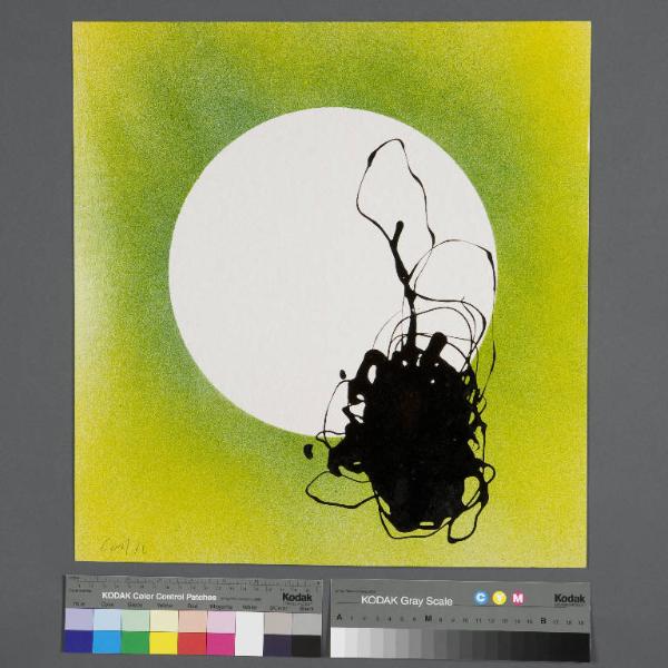 La porzione centrale della composizione è vivacizzata da un enorme clipeo bianco, sul quale si imposta, nella parte inferiore destra, una consistente e spessa colata di vernice nera, fatta cadere direttamente dal pennello. Esternamente al clipeo, la superficie di fondo presenta una colorazione verde e gialla data a spry.
