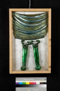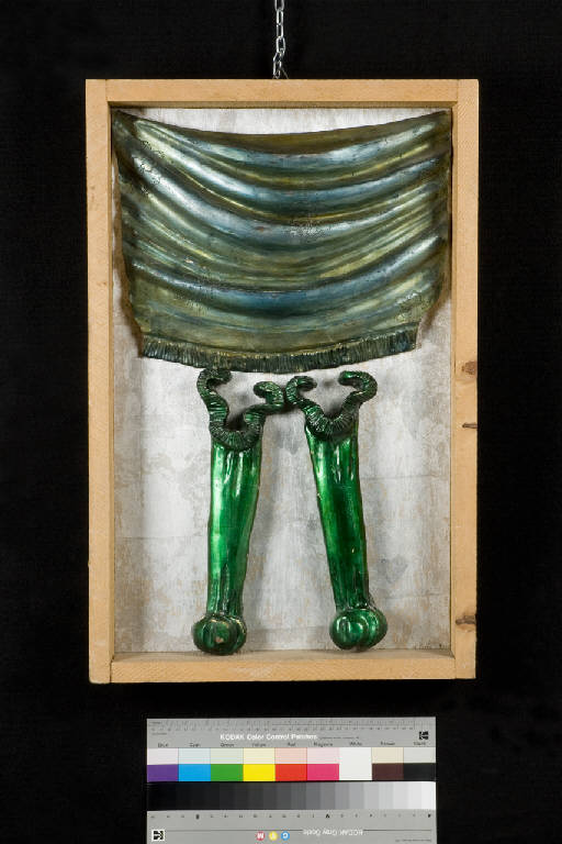 Entro una semplice cornice, con legno lasciato rustico, sono assemblate porzioni decorative di antiche balaustre su un fondo argentato. I singoli pezzi sono stati ridipinti con colori accesi e cangianti. La porzione superiore è rappresentata da un drappo ligneo verde smeraldo sfrangiato, con fiori a puzone, sostenuto inferiormente da due sostegni del medesimo colore con piedi a voluta.
