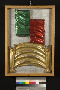 Entro una semplice cornice, con legno lasciato rustico, sono assemblate porzioni decorative di antiche balaustre, ridipinte con colori accesi e cangianti. Sul fondo argentato della composizione si stagliano tre drappi: nella porzione inferiore un ampio drappo ligneo dorato sfrangiato e fiori a puzone, è compreso tra due sostegni verticali con piedi a voluta. Nella porzione superiore due drappi con fiori e frangia, di cui uno rosso e l'altro verde, si affiancano sfalsati.