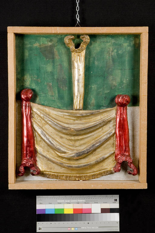 Entro una semplice cornice, con legno lasciato rustico, sono assemblate porzioni decorative di antiche balaustre, ridipinte con colori accesi e cangianti. Un ampio drappo ligneo dorato e sfrangiato, con fiori a puzone, compreso tra due sostegni verticali con piedi a voluta rosso acceso, si staglia su un fondo argentato. La porzione superiore si caratterizza per la presenza al centro, di un sostegno dorato, che risalta sul fondo verde brillante.