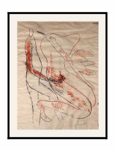 Leda e il cigno reso con veloci tratti policromi: un grande cigno abbraccia un corpo femminile stilizzato, mentre Giove a sua volta l'abbraccia da dietro.