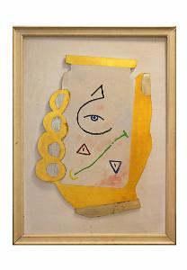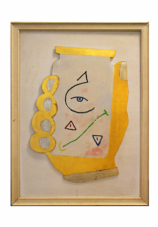 Una mano dorata stringe un barattolo con coperchio vivacizzato da motivi decorativi stilizzati policromi stesi a pennello (simboli misterici quali un occhio divino).