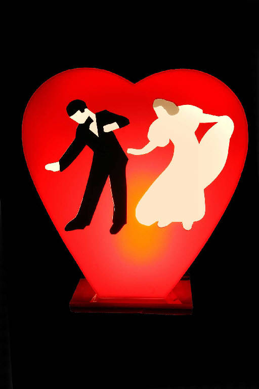 Scultura luminosa, lampada da tavolo in forma di cuore rosso, su cui sono raffigurate, su entrambe le facce, coppie identiche di ballerini, nei colori bianco, nero e grigio.