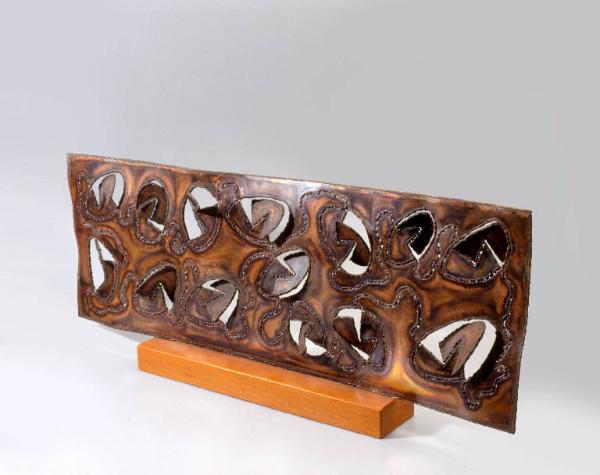 Composizione con elementi trapezio ovoidali traforati, ritagliati ed estroflessi in lamina di rame, su base lignea rettangolare.