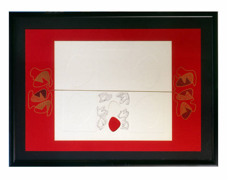 Su un cartoncino rosso di fondo si posiziona un ulteriore foglio bianco, di minori dimensioni, sul quale sono impressi, nella porzione superiore, i moduli trapezio-ovoidali, cari all'artista, separati da una linea orizzontale dorata. Nella porzione inferiore due forme analoghe si ripetono ai lati, mentre al centro quattro moduli disegnati a china comprendono un ritaglio inciso. Sul cartoncino rosso di fondo i moduli si ripetono in verticale.