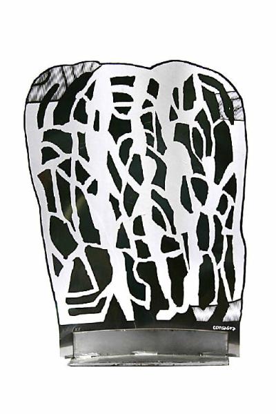 Scultura sottilissima in lamina d'acciaio fotoincisa con motivi geometrici, poggiante su base in ferro verniciato non originale. L'opera è l'esemplare XX di XX.