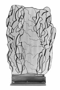 Scultura sottilissima in lamina d'acciaio fotoincisa con disegni astratti, quasi una quinta teatrale che si apre su un cielo nuvoloso, poggiante su base rettangolare. Di dimensioni minori rispetto al solito probabilmente in quanto Prova d'artista: in basso a sinistra si legge inciso: "V/PA". La firma dell'autore in basso a destra in corsivo con iniziale maiuscola, è fotoincisa.