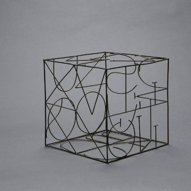L'opera, realizzata in 20 esemplari, rappresenta lettere dell'alfabeto in bacchette di ottone pieno disposte a comporre le pareti del cubo.