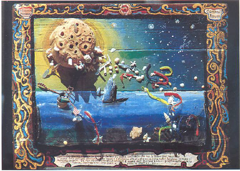 L'opera che fa parte della serie dalle "Città invisibili" e "Cosmicomiche", è cartterizzata da una cornice policroma a volute con iscrizione entro cartiglio con citazione da Calvino. Entro la cornice si staglia un'enorme luna fortemente rilevata con crateri. Conchiglie, ami, plancton, pesciolini e coralli sembrano magnetizzati dalla luna. A sinistra una figura umana naviga su una barchetta su cui si appoggia una scala che sale fino alla luna.