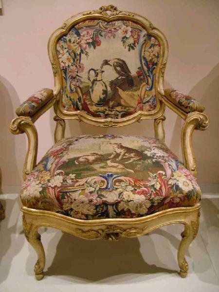 Serie di sei poltrone con schienale dalla forma ampia e dilatata; sedili, spalliera e braccioli imbottiti e rivestiti con arazzo di Beauvais.