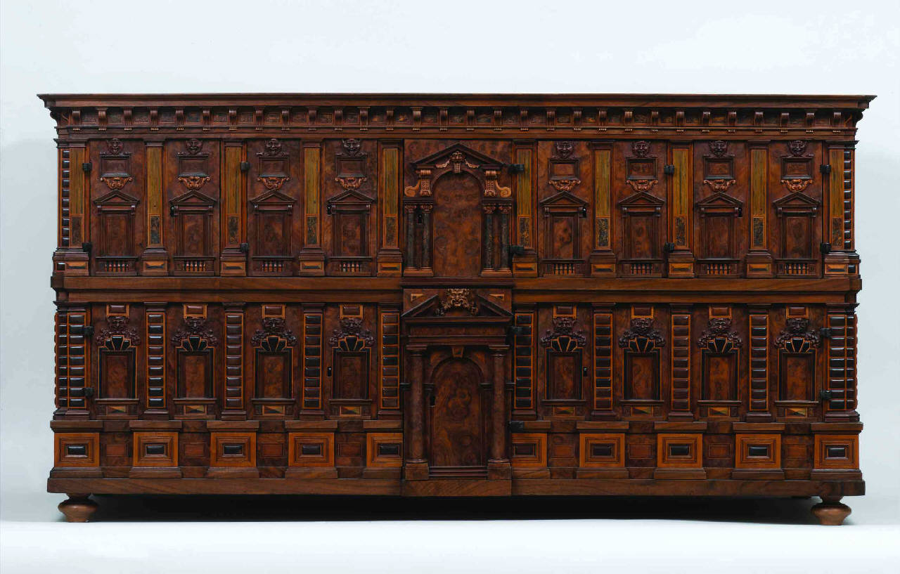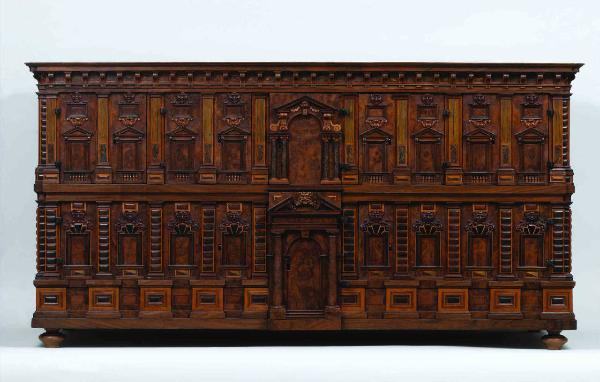 - NOTIZIE STORICO CRITICHE Lo stipo, che raffigura la facciata di un palazzo, ha due cassetti inseriti nello zoccolo inferiore, mentre altri sedici cassetti, celati dietro la serie delle finestre dei due ordini che costituiscono il fronte apribile del palazzo, sono stati posti ai lati del portone centrale e della serlia-na ad esso sovrapposta e che chiudono, a loro volta, due piccoli vani di cui quello inferiore con due cassettini in alto. L'architettura della facciata riprende con alcune varianti (ad esempio la serliana al centro del secondo ordine di finestre e l'alternanza dei timpani semicircolari e triangolari di quest'ultime) quella del palazzo genovese Doria Tursi costruito tra il 1572 e il 1579 per volere di Niccolo Grimaldi su progetti degli architetti Domenico e Giovanni Ponsello, allievi dell'Alessi.\nCome ha individuato Clelia Alberici, sulle cerniere di metallo cesellato che permettono l'apertura dello stipo appare ripetuto lo stemma di Ulpiano Volpi con il motto "STA FORTE". Vescovo di Chieti e Novara, il Volpi, di cui esiste un busto eseguito dall'Algardi nel Museo Poldi Pezzoli di Milano (Inv. n. 410), nacque a Como il 22 giugno 1559 e morì a Roma il 10 marzo 1629. Elencato tra i beni inviati a Como dopo la sua morte (secondo quanto riportato dalla Alberici), lo stipo venne probabilmente eseguito su commissione del Volpi, da anonimi artigiani genovesi tra il 1579, anno in cui fu terminata la costruzione di palazzo Doria Tursi, e il 1629, data della morte del vescovo.