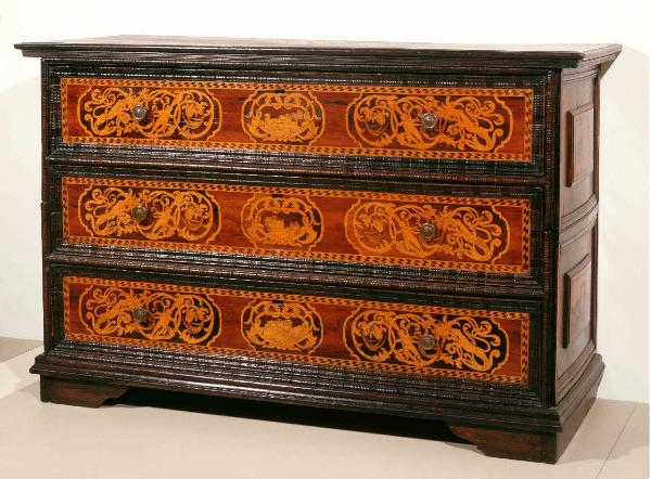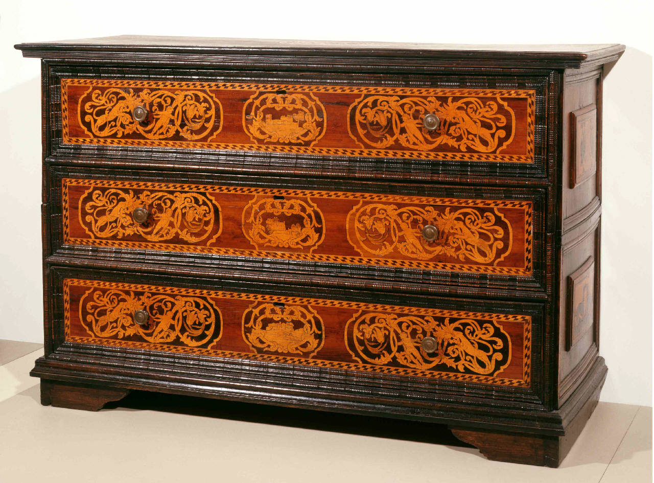Cassettone con specchiature intarsiate entro le riquadrature dei cassetti raffiguranti i motivi decorativi a forma di volute e putti.