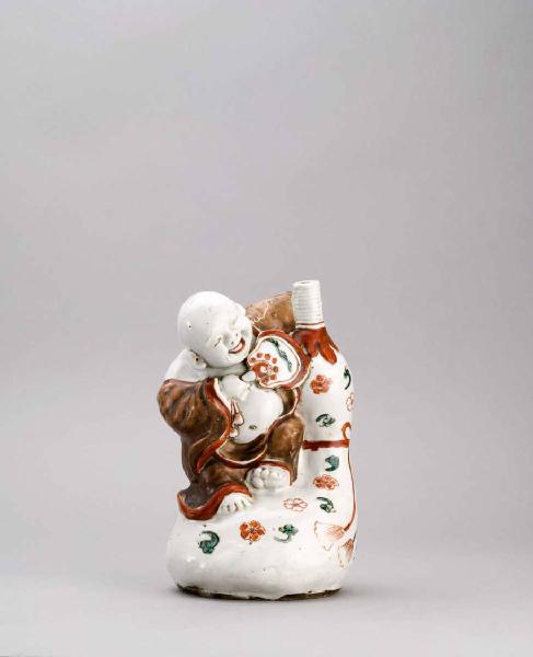 Vasetto in porcellana a forma di fiaschetta 'a zucca', sulla quale si aggrappa Hotei con ventaglio. La decorazione è dipinta a smalti rosso, verde e nero, applicati al di sopra dell'invetriatura trasparente.