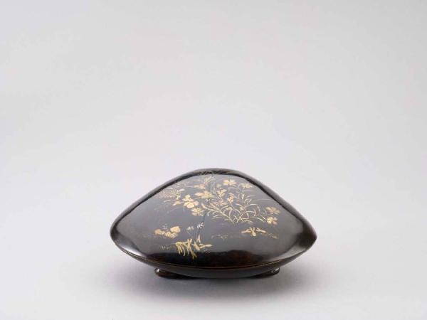 Scatoletta a forma di conchiglia (kaigatakogo) in ceramica smaltata tipo craquelé in marrone chiaro, con due aree laterali in verde colante sottocoperta. Decorata esternamente con cesto di fiori laccato in oro (toshitsu).