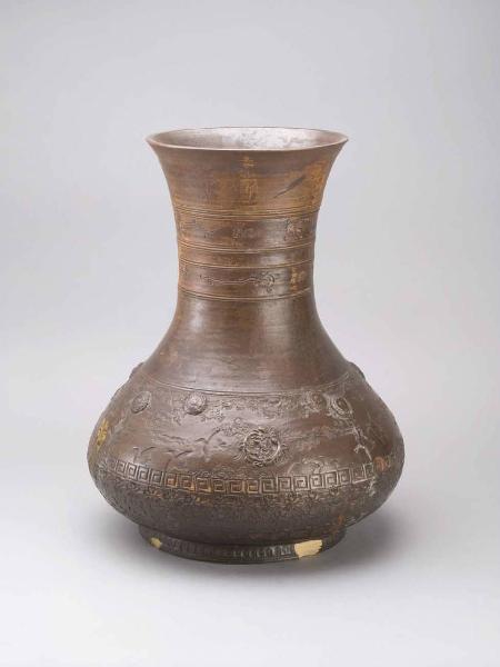 Vaso a sezione circolare con corpo espanso, lungo e robusto collo cilindrico e bocca svasata. In ceramica di tonalità rosso-marrone, presenta sulla superficie esterna non invetriata una serie di bande decorate, in alto e basso rilievo, con motivi geometrici e floreali, con l'aggiunta di medaglioni circolari con drago (ryu).