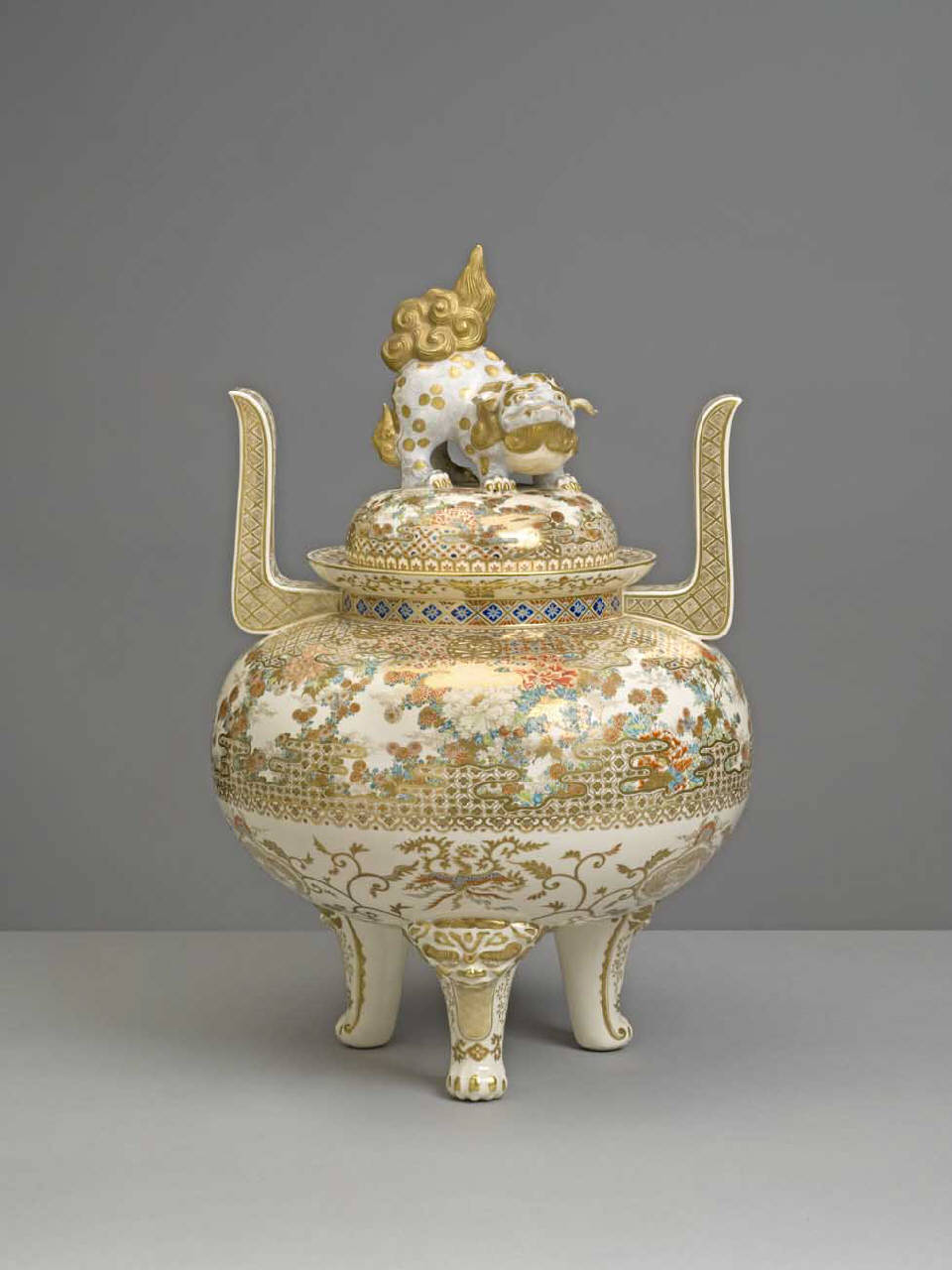 Incensiere tripode in ceramica con corpo globulare, dotato di due anse verticali traforate; decorato a smalti blu, verde, rosso e oro, a scomparti rettangolari fittamente campiti da ornati geometrici e fiori. Parte inferiore decorata con draghi. Coperchio traforato con pomolo a foggia di "leone cinese" (karashishi).